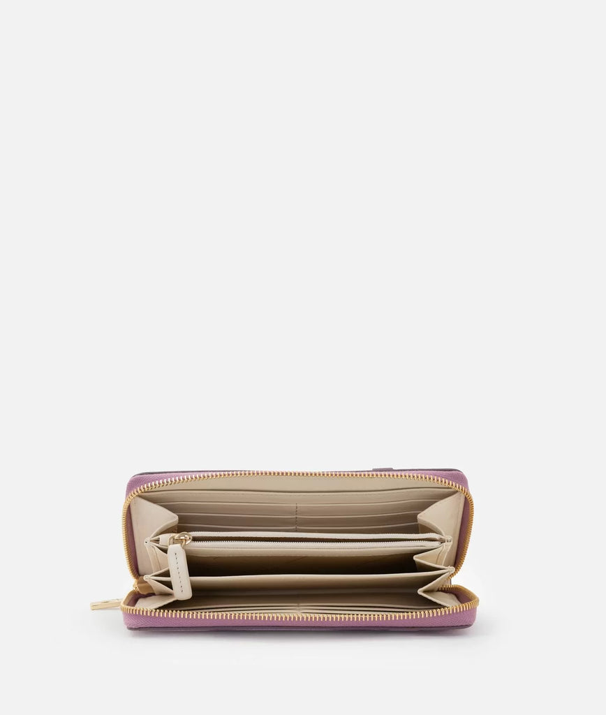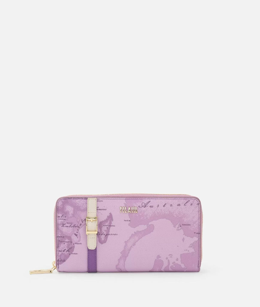 Le nuove nuance malva della stampa Geo Orchidea sono protagoniste in questo portafoglio zip around in tessuto goffrato saffiano. È arricchito nella parte frontale dal dettaglio con fibbia logata e inserto a contrasto, che lo personalizza e lo illumina, insieme al lettering 1ᴬ Classe in oro chiaro. Le dimensioni sono capienti, ottime per l'uso quotidiano, e la chiusura con zip lo