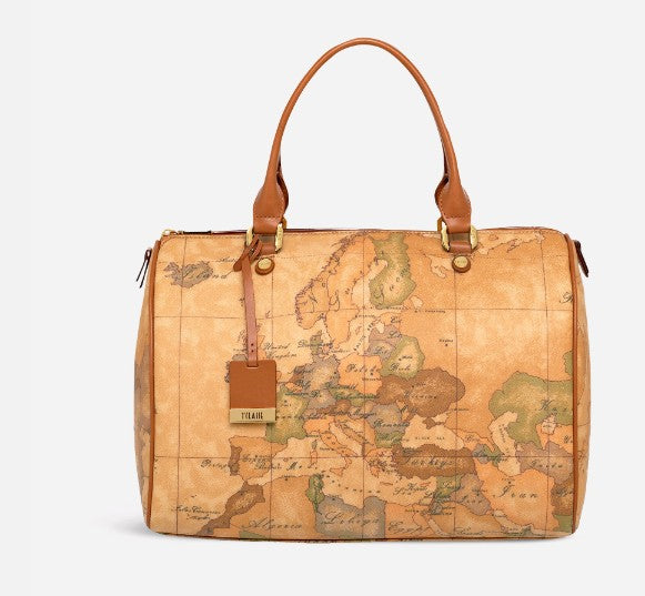 Borsa a bauletto in tessuto stampato con cartina geografica Geo Classic con manici tubolari in pelle color cuoio, metalleria con logo 1ᴬ Classe e finiture in oro, chiusura con zip. Disponibile in due misure, capiente e versatile, saprà adattarsi con stile a tutti i tuoi look.