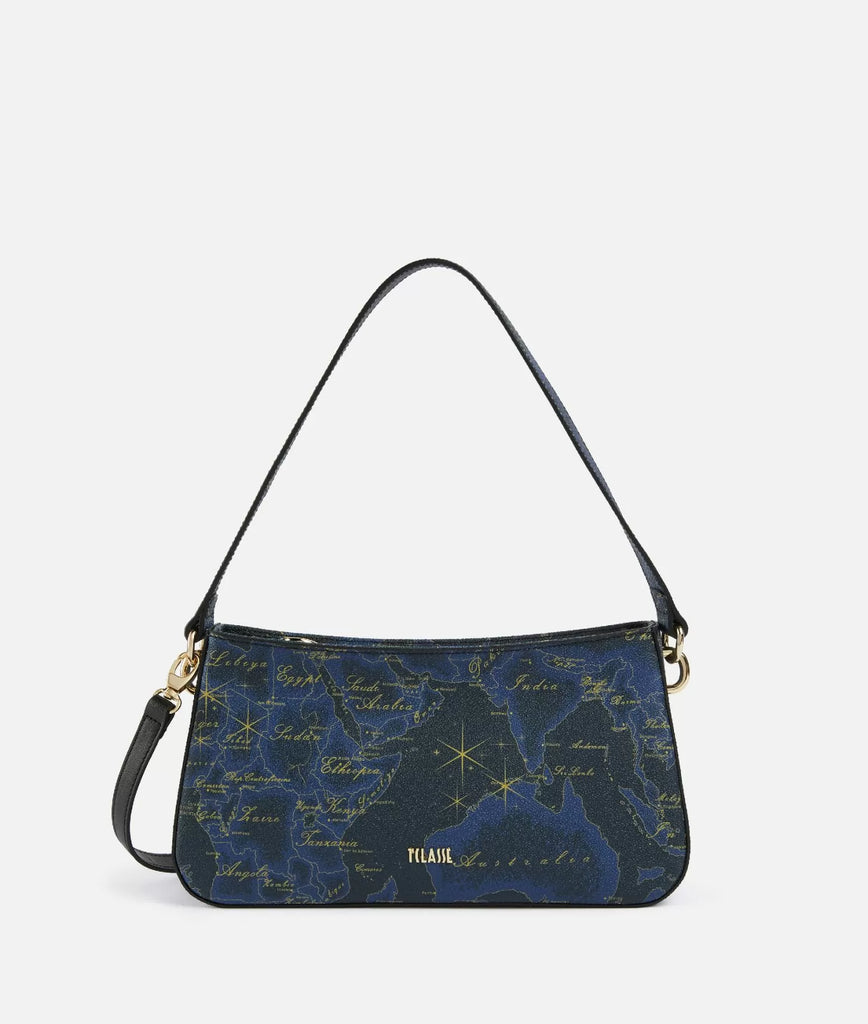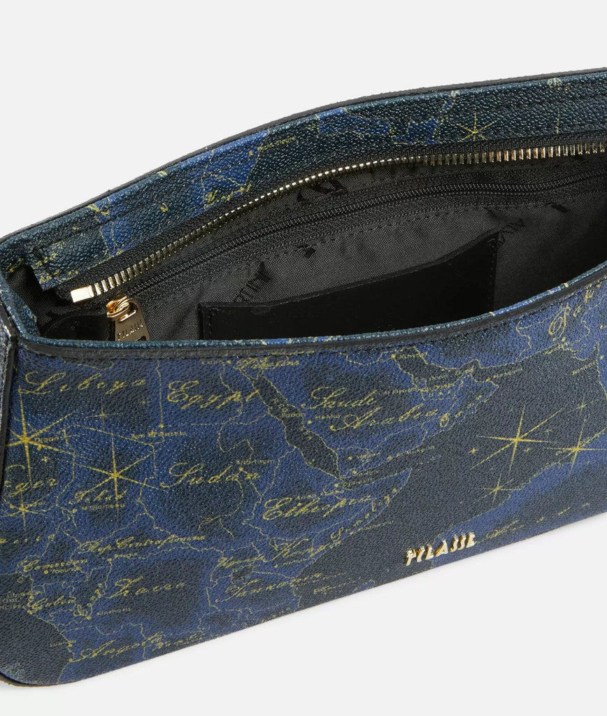 La notte più magica dell'anno è racchiusa nella borsa sottospalla Geo Midnight, realizzata nel nuovo tessuto di Collezione. Un cielo stellato ricopre l'iconica mappa Geo, declinata in eleganti e suggestive sfumature blu: l'insieme è illuminato dal logo 1ᴬ Classe in oro chiaro. Grazie alla tracolla rimovibile e alle tasche interne è un modello da occasioni speciali che si rivelerà perfetto anche nei pomeriggi di svago, per respirare appieno l'atmosfera della stagione delle feste.