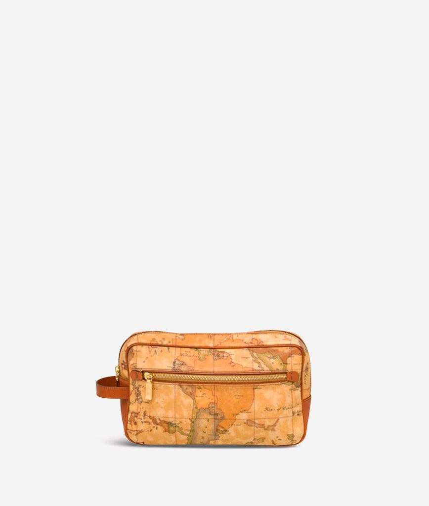 Beauty case in tessuto stampato con cartina geografica Geo Classic dalla forma squadrata, con tasca frontale, dettagli in pelle di vacchetta color cuoio, tasche interne, chiusura con zip. Un accessorio elegante con tutto lo spazio per portare il tuo mondo con te.