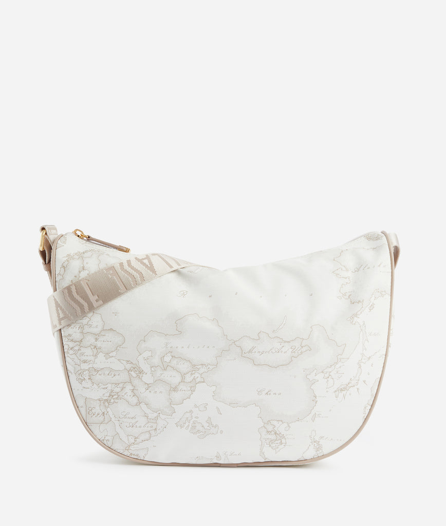 La tracolla a mezzaluna grande in tessuto soft vanta volumi morbidi e capienti che mettono in evidenza l'iconica stampa Geo Classic. Rifinita da dettagli in eco-pelle e dalla tracolla regolabile in nastro jacquard logato 1ᴬ Classe, è un modello pratico che fonde lo stile casual con l'iconicità del brand.
